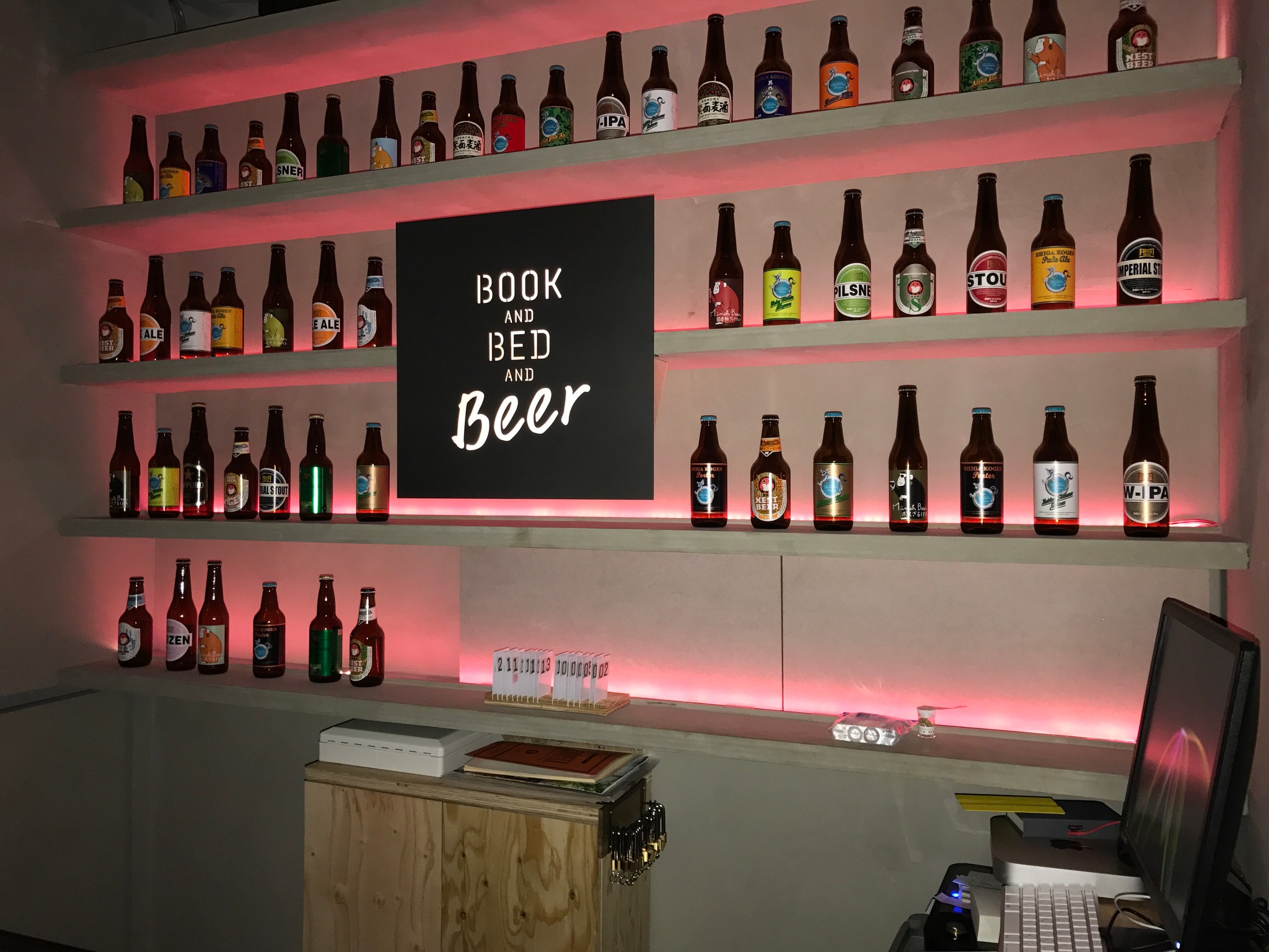 過了第一道門,彷彿到了夜店,牆上滿是啤酒瓶,錯愕之餘店員不知從哪鑽了出來,打開 Max Gunawan 所設計的 Lumio 燈,開始登記的動作。稍稍閒聊,店員很驚訝我們怎會找到這間 hostel(到訪時京都店開幕沒多久,想必現在應該滿滿的台灣人了吧!),因為沒有要住宿,只簡單填寫名字與進入時間後,店員打開第二道門鎖,正式進入 book and bed 的空間開始假掰體驗看書的時光。