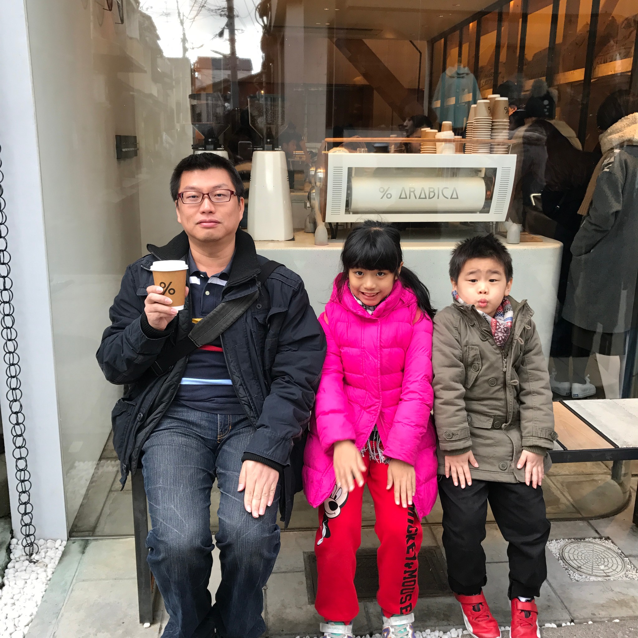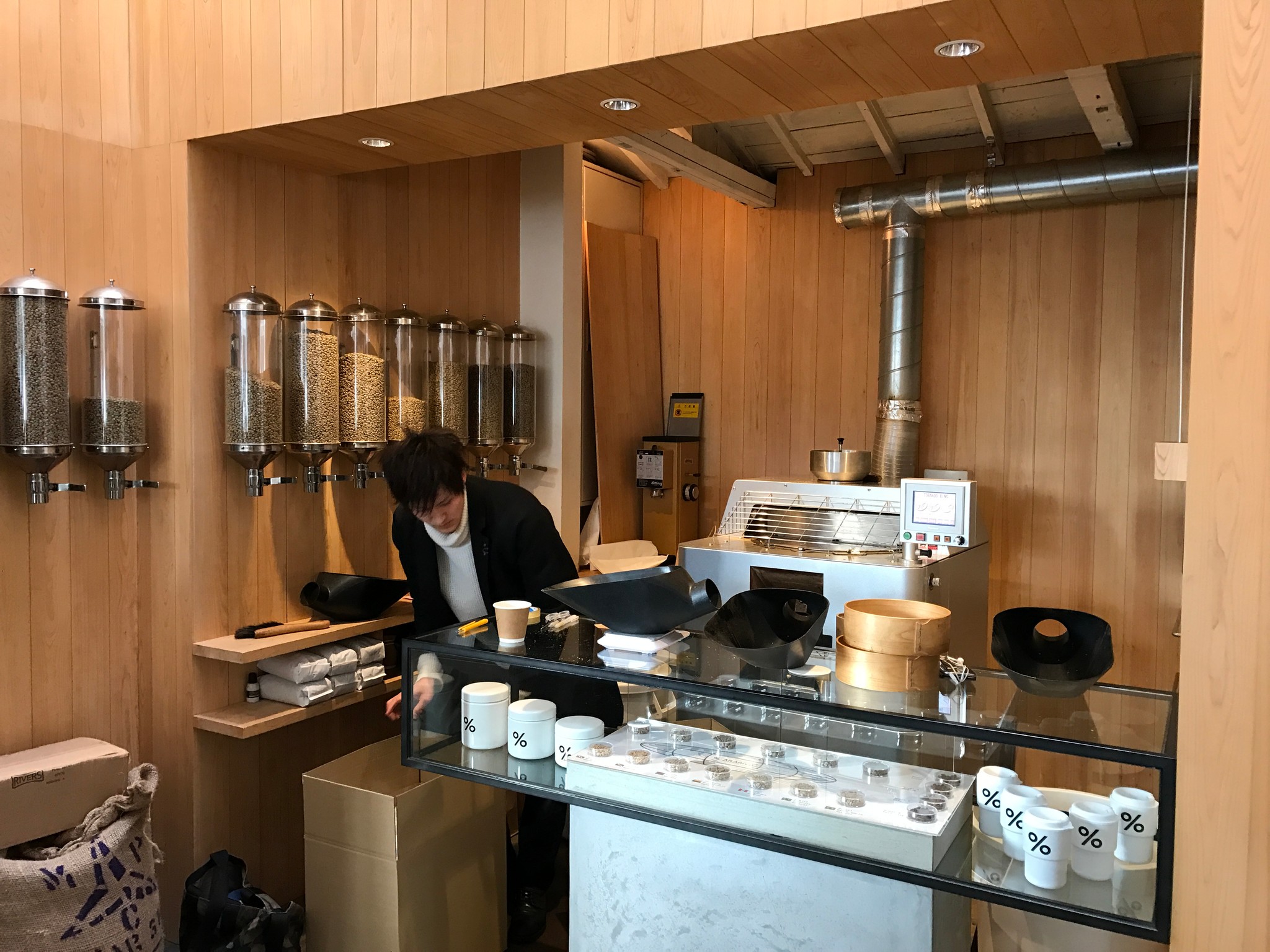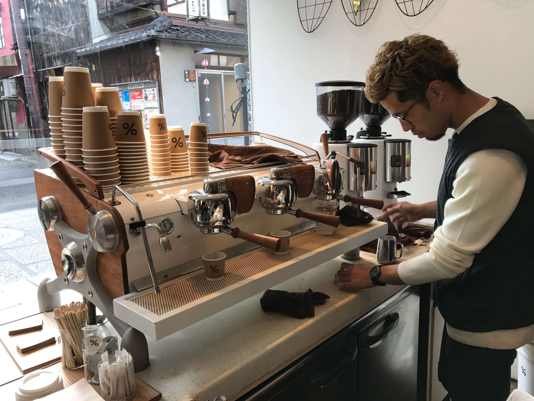 這天的行程是先到清水寺,走二三年坂到祇園附近,參觀完 book and bed 之後到京都岡崎 蔦屋書店。途中經過近期紅透半片天的 % Arabica Kyoto 東山,能在一級咖啡戰區的京都迅速擴點甚至是海外開分店,走的是完全和 Inoda coffee 不一樣的道路,使用像是 ipad 點餐、高檔咖啡製作器材像是 Slayer espresso 等,有點走布魯巴透的味道。由於咖啡不是我的強項,所以點了杯拿鐵試試。東山店的店長山口淳一拉花似乎很厲害,可惜到訪當日並沒有看到本人。